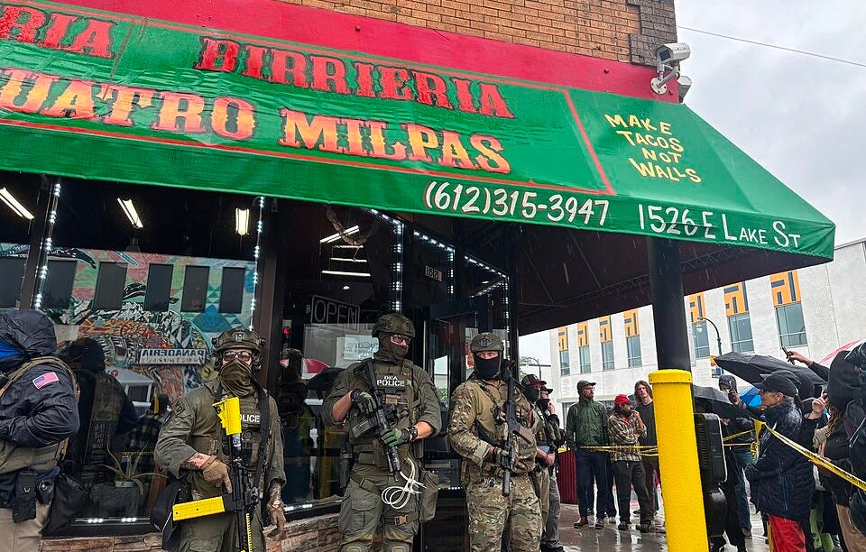 Wrecktangle Pizza, in the heart of busy Lake Street in the Lyn-Lake neighborhood, was visited by federal agents a day after posting on social media that it would accept contributions and donate food to locals affected by the crackdown. Co-owner Jeff Rogers said the restaurant was closed at the time and that staff members inside reported the agents tried multiple doors.